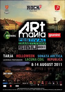 Festivalul ARTmania are loc in cea de-a doua saptamana a lunii august (8-14 august 2011) si prezinta un program cultural adaptat publicului si atmosferei cetatii medievale prin concerte, expozitii si evenimente speciale dedicate artelor frumoase. Concertele din Piata Mare vor avea loc in zilele de vineri si sambata, 12 si 13 august. In acest an sase importante nume ale scenei rock internationale vor urca pe scena din Piata Mare: Lacrimas Profundere, Helloween si Tarja in ziua de vineri; Republica, Sonata Arctica si Lacuna Coil in ziua de sambata. Standul Harley Davidson va fi amplasat in Piata Mare, iar parada va porni de aici sambata la ora 12:00 si va ajunge in spatiul festivalului amenajat in padurea Dumbrava: ARTmania Festival Arena 2011. Motoarele se vor intoarce in jurul orei 16:00 in Piata Mare pentru a da startul concertelor de sambata.