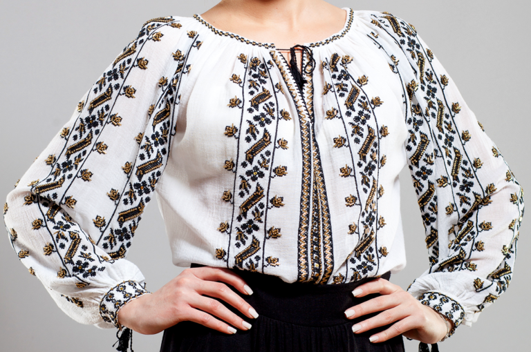 Motivele populare și stilul etno sunt întotdeauna relevante, mai ales atunci când călătoresc peste hotare. Și de ce să nu apelezi la motivele populare ale țării tale? Ia românească este la modă astăzi, arată proaspăt și are o asemenea varietate de caracteristici geografice și istorice, încât toată lumea poate găsi pentru sine ceva interesant și original. Principala regulă este ca elementele stilului românesc să fie combinate armonios cu hainele moderne. Nu este necesară reproducerea completă a unei rochii populare pentru a merge la cinema și cu atât mai mult pentru a lucra. Stilizările ușoare sunt suficiente pentru viața obișnuită. O ie neagră de mătase cu broderie grațioasă, va arăta grozav cu o fustă creion și o vestă cu motive naționale.