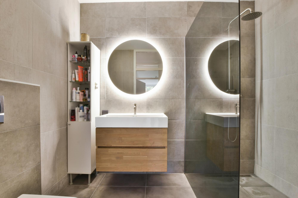 Dacă ai posibilitatea, alege o oglindă cu iluminare LED integrată sau montează spoturi deasupra acesteia pentru un efect modern și funcțional.