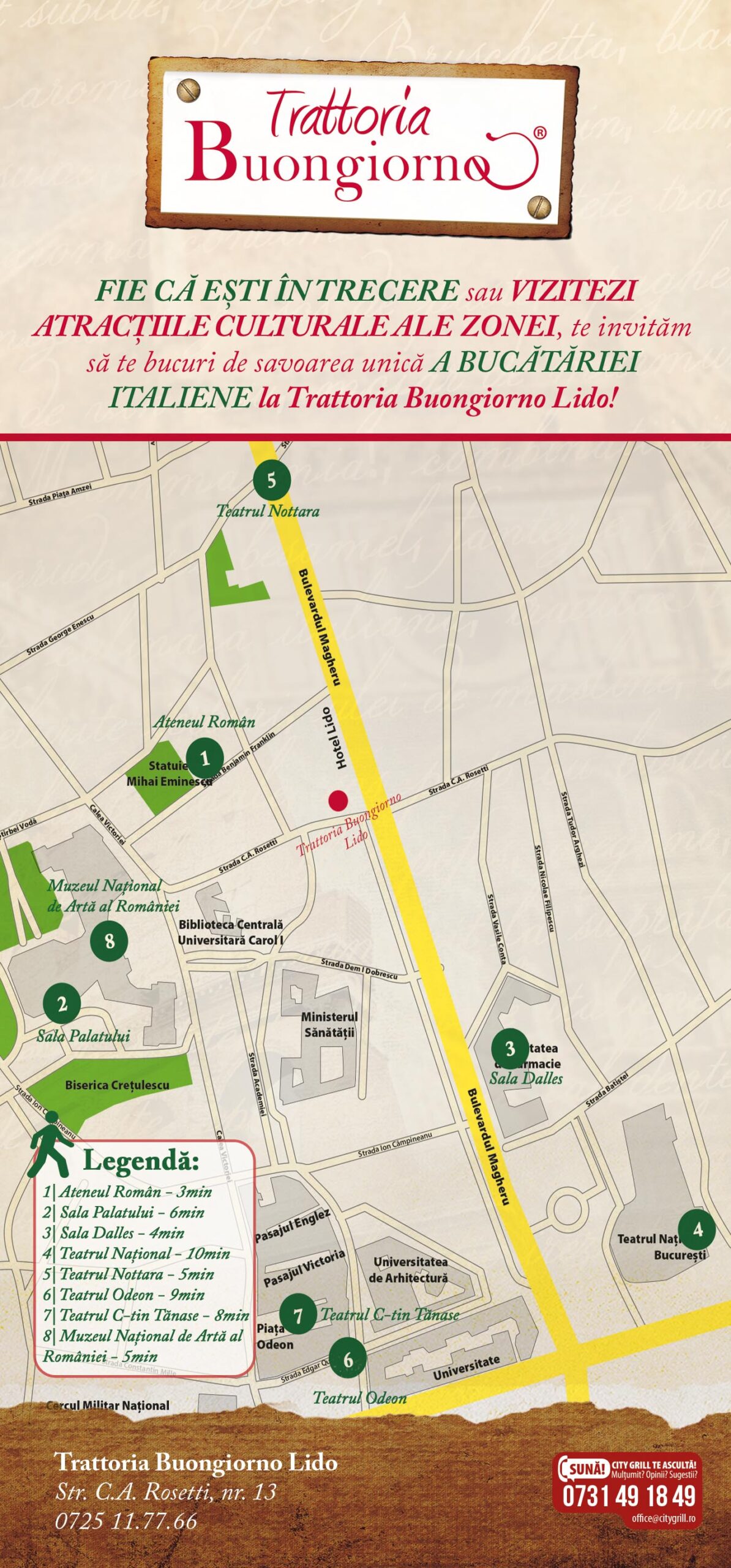 Bine pozitionat, usor de gasit, cu preturi competitive, cu o echipa profesionista, Trattoria Buongiorno Lido este cea mai buna alegere pentru angajatii companiilor din jur si pentru iubitorii de cultura, care doresc sa-si incheie serile cu o cina gustoasa.