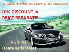Astfel, reparatiile efectuate in service-ul nostru, in perioada 1 - 31 iulie 2012, pentru toate variantele AUDI A3 vor beneficia de o reducere de 10% din costul total. Pentru a face o programare, este suficient sa accesati www.indeo-auto.ro si sa completati formularul din pagina “Contact” cu datele dumneavoastra sau sa telefonati la 0758.117.866.