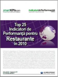 18 Octombrie 2011, Cluj Napoca – www.IndicatoridePerformanta.ro, cea mai mare comunitate de profesionişti din România specializată în măsurarea şi managementul performanţei, în colaborare cu smartKPIs.com, cea mai documentată bază de date cu indicatori de performanţă la nivel internaţional, anunţă lansarea raportului „Top 25 Indicatori de Performanţă pentru Restaurante în 2010”. Raportul prezintă în detaliu Indicatori de Performanţă (KPIs) precum: ” $ Venit per loc disponibil per oră”, „# Reclamații per comandă în restaurant”, sau „% Rezervări anulate”, alături de alte exemple populare în 2010. Utilizarea instrumentelor este esenţială pentru atingerea rezultatelor, iar Indicatorii Cheie de Performanţă (KPIs) sunt astăzi printre cele mai populare instrumente de management.