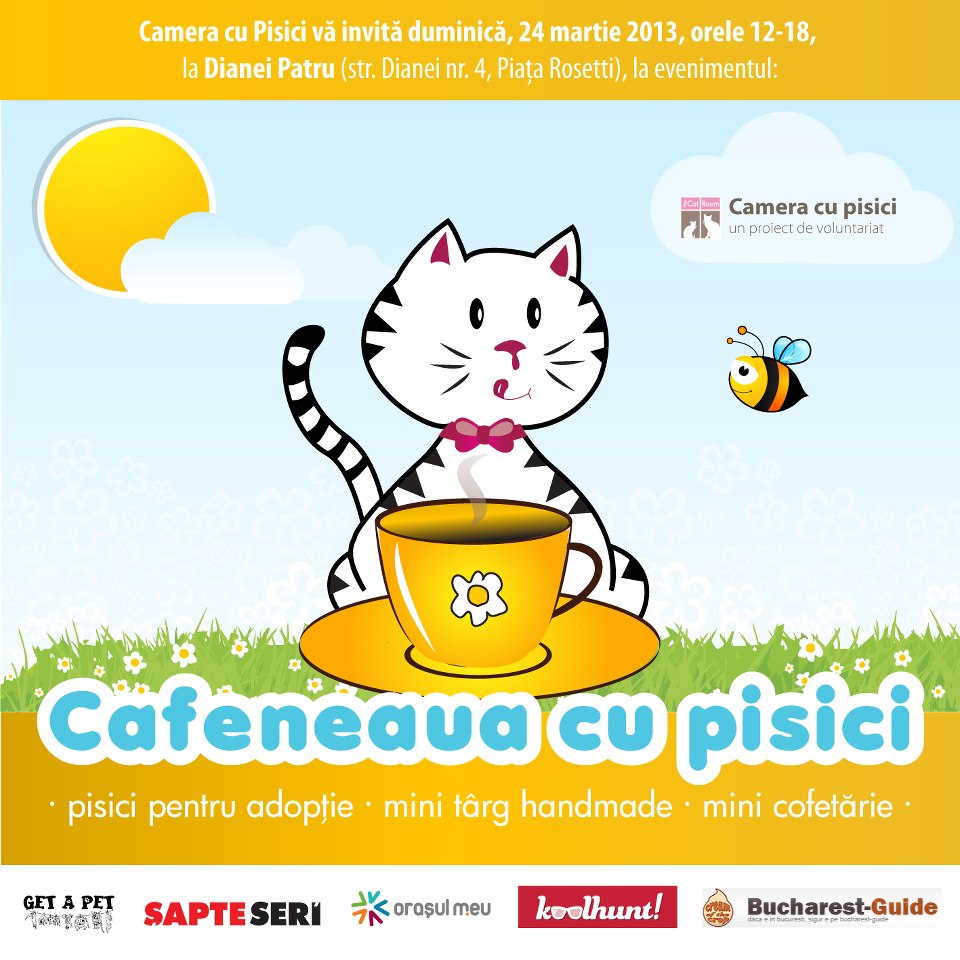 Cafeneaua cu Pisici îşi va deschide porţile pentru toţi iubitorii de pisici care doresc să adopte sau să sprijine material activitatea proiectului de voluntariat. La eveniment, vor fi prezente şi gata de adopţie o parte din pisicile aflate in grija Camerei cu Pisici, iar pentru a le ajuta pe cele care încă îşi aşteaptă familiile, puteţi face donaţii sau puteţi cumpăra obiecte hand-made (donate de diverşi creatori din ţară) şi prăjiturile pregătite cu drag de voluntarele Camerei cu Pisici. Banii obţinuţi din vânzări vor fi utilizaţi pentru îngrijirea pisicilor salvate de pe stradă. Sunt la fel de binevenite și donaţiile în hrană sau obiecte (noi sau vechi) utile pisicuţelor: mâncare umedă sau uscată, jucării, sisaluri, pătuţuri, pernuţe sau orice altceva consideraţi de cuviinţă.