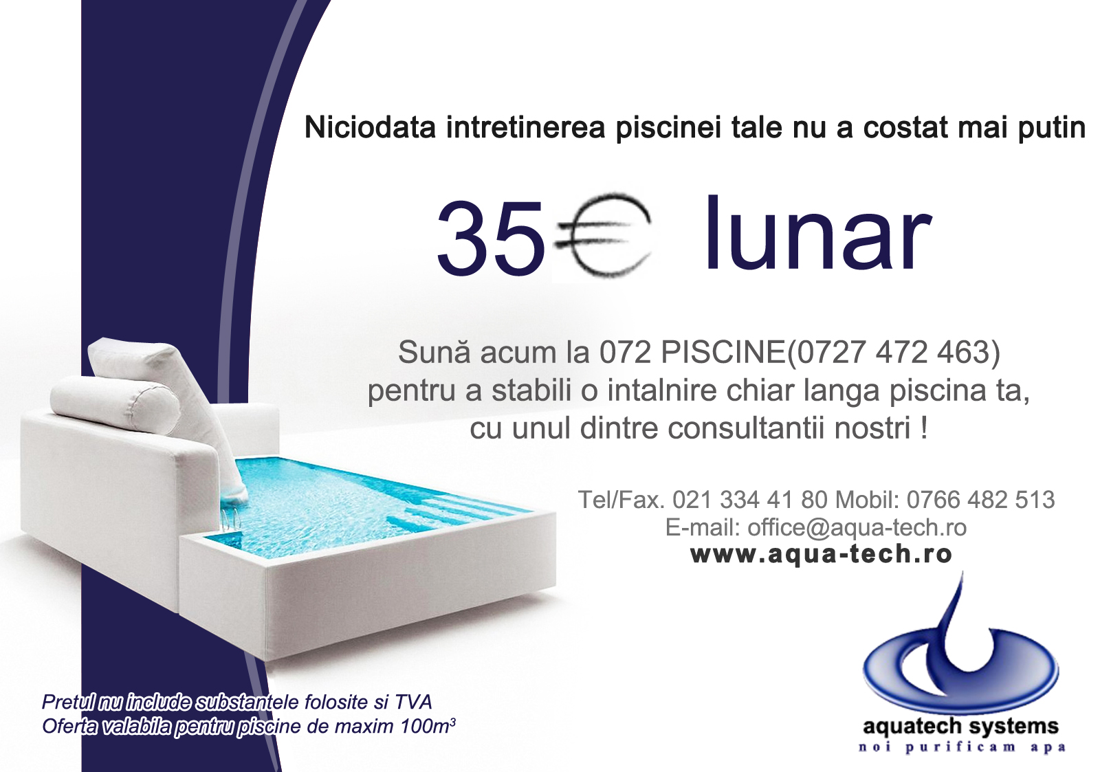 Si pentru ca Aquatech System isi propune ca sezonul acesta sa fie unic, a pregatit un pret pe masura: 35 de euro/luna (pret valabil pentru piscinele cu volum de maximum 100 mc apa).