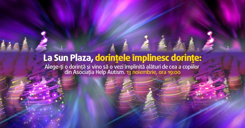Evenimentul de anul acesta aduce ceva in plus si marcheaza un moment special pentru copiii de la Asociatia Help Autism. Prin intermediul aplicatiei de pe pagina de Facebook Sun Plaza, „Dorintele implinesc dorinte”, centrul comercial va implini dorintele a trei dintre vizitatorii sai in ziua de 13 noiembrie si, in acelasi timp, dorintele a 170 de copii cu tulburari din spectrul autist. Astfel, Sun Plaza isi continua programul de CSR intr-un mod creativ si inedit, oferind ocazia fanilor sa contribuie la bucuria unor copii deosebiti, prin intermediul retelei sale sociale.