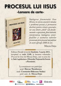 Editura Herald va invita Sambata, 5 martie 2011, incepand cu orele 13:00, la lansarea volumului Procesul lui Iisus de Mircea Dutu, care va avea loc in Sala Lapidarium a Muzeului National de Istorie a Romaniei.