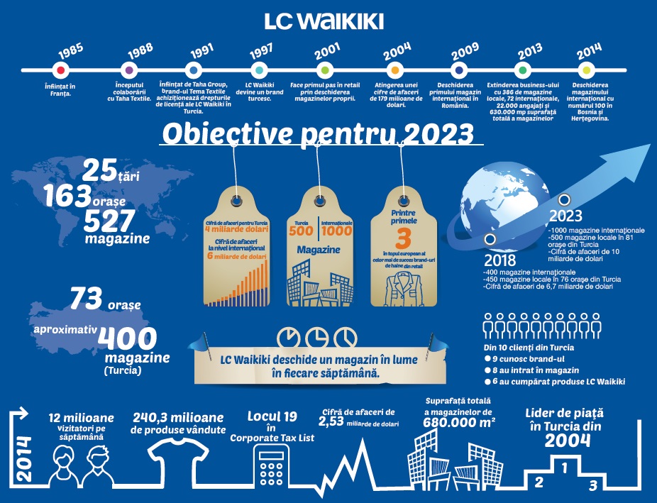 Cifra de afaceri in anul 2014 a companiei LC Waikiki: 2,53 miliarde de dolari, iar obiectivul cifrei de afaceri pentru anul 2015 este de 2,7 miliarde (in Turcia, international, online).
