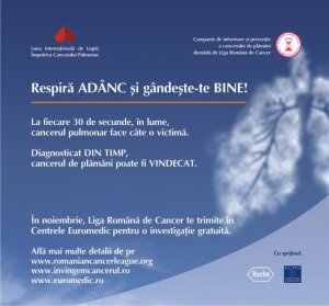 Liga Romana de Cancer lanseaza, in luna noiembrie, o campanie de informare si educare privind implicatiile cancerului la plamani, sub mesajul „Respira adanc si gandeste-te bine!”, beneficiind de sprijinul companiilor Roche Romania si Euromedic Romania.