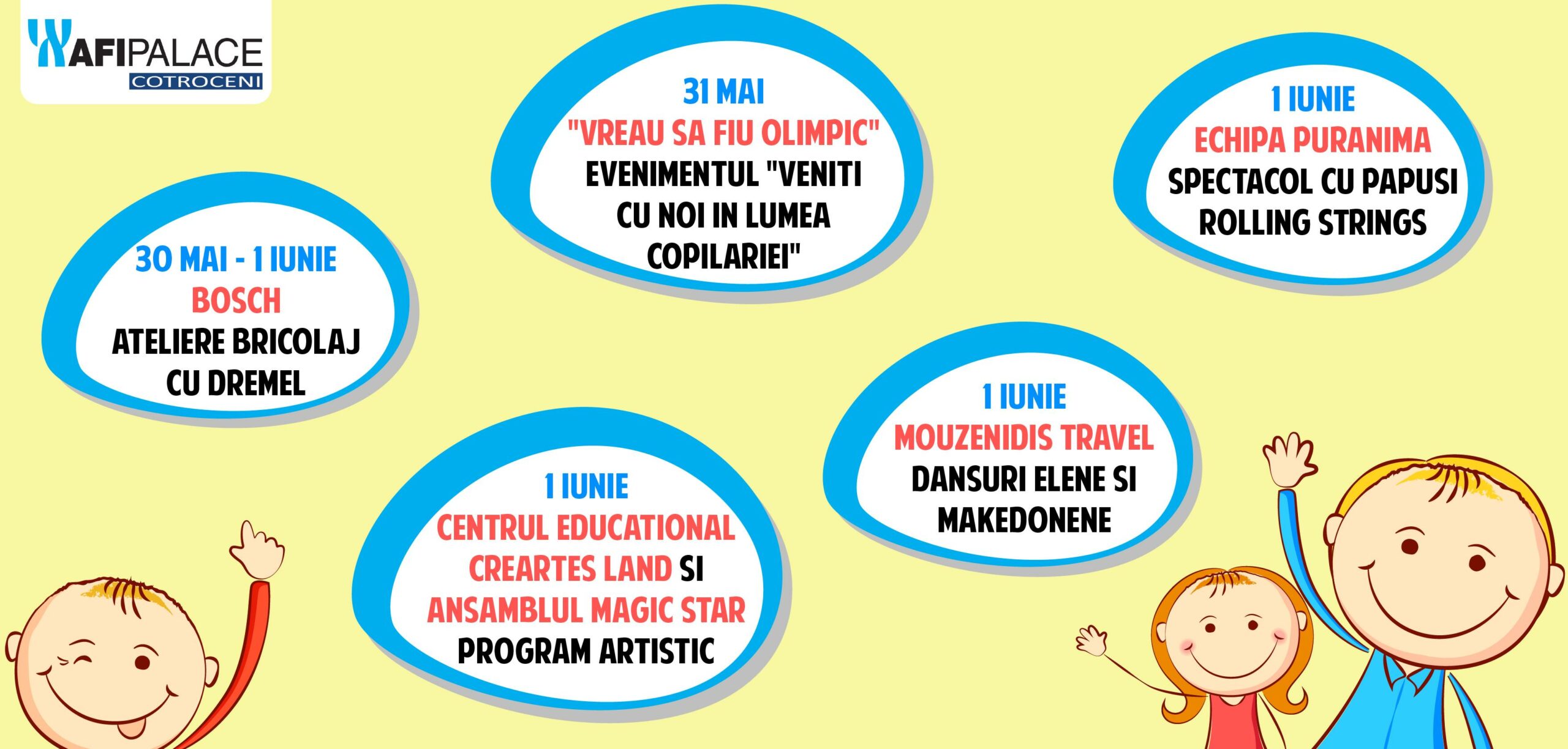 In perioada 30 mai – 1 iunie, AFI Palace Cotroceni a pregatit numeroase surprize pentru cei mici si insotitorii lor. Vizitatorii vor putea participa la ateliere, spectacole, concerte, momente de dans si concursuri, pentru a incheia Luna lui MAI Mult si pentru a sarbatori Ziua Copilului.