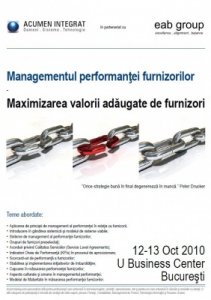 Cluj-Napoca, 9 Septembrie 2010 - Acumen Integrat organizeaza cursul Managementul performantei furnizorilor – Maximizarea valorii adaugate de furnizori care urmareste imbunatatirea performantei organizationale.