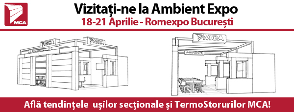 MCA Grup, cel mai mare producator de usi de garaj din Romania, participa, intre 18 si 21 aprilie (de joi pana duminica), la Ambient Expo 2013, Romexpo Bucuresti, pavilionul central, C1, platforma 4. Te invitam alaturi de noi sa vezi cele mai noi modele de usi de garaj si sa afli care sunt promotiile MCA pentru clientii ce vor da comenzi de usi de garaj direct la stand!