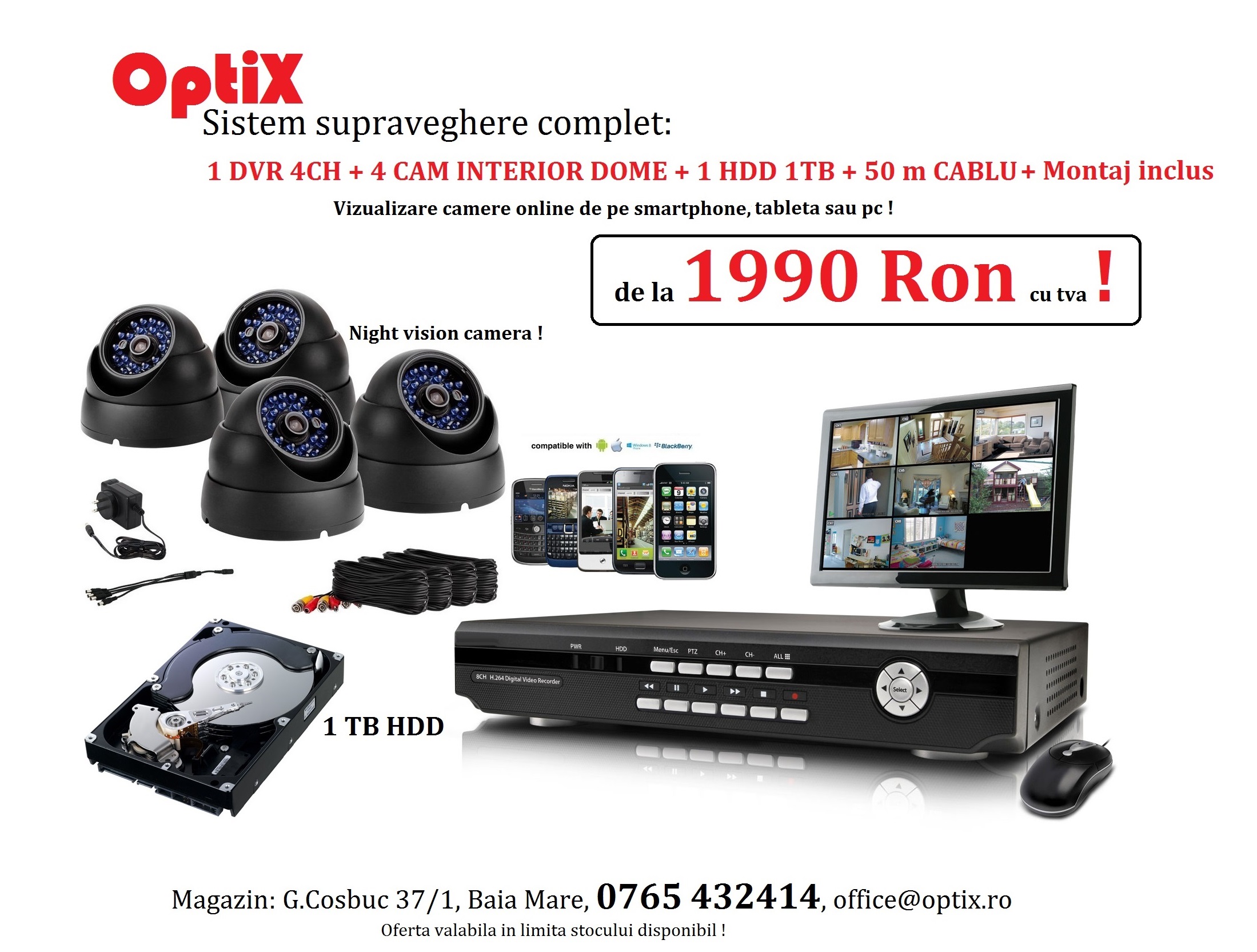 OFERTA : sistem supraveghere video profesional, conectat online, vizualizare de pe smartphone : 4 CAMERE SUPRAVEGHERE DOME INTERIOR cu night vision + 1dvr 4CH + 1 HDD 1TB + 50 M CABLU + MONTAJ incepand cu 1990 ron !