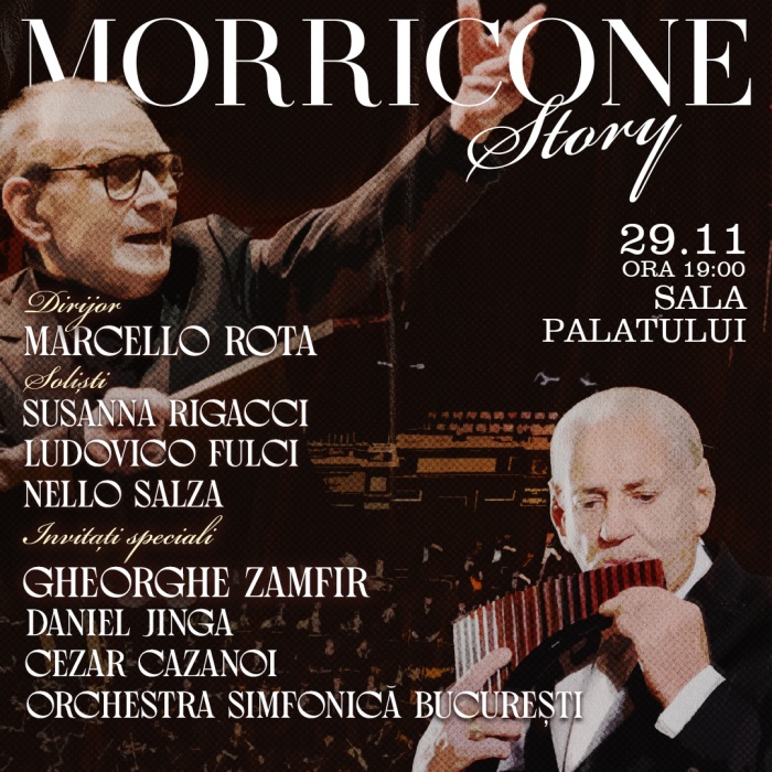 Pe 29 noiembrie, Sala Palatului din București va găzdui în avanpremieră concertul „Morricone Story”, un “spectacol eveniment” în care publicul va asculta compozițiile premiate ale marelui maestru al muzicii de film, Ennio Morricone, cu prezența soliştilor care au făcut istorie împreună cu marele compozitor italian, Nello Salza (trompetă), Ludovico Fulci (pian) și Susanna Rigacci (soprană).