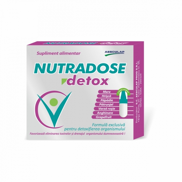 Datorita formulei exclusiv concepute pentru a ajuta la procesul de detoxifiere al organismului, Nutradose Detox este ajutorul de nadejde al organismului. Extractele standardizate cu absorbtie rapida din Papadie, Mere, Anghinare, Varza rosie, Patrunjel, Seminte de Grapefruit si Hrisca, alcatuiesc un cocktail unic, 100% natural ce asigura starea de sanatate a intregului organism prin reducerea retentiei hidrice si eliminarea toxinelor.