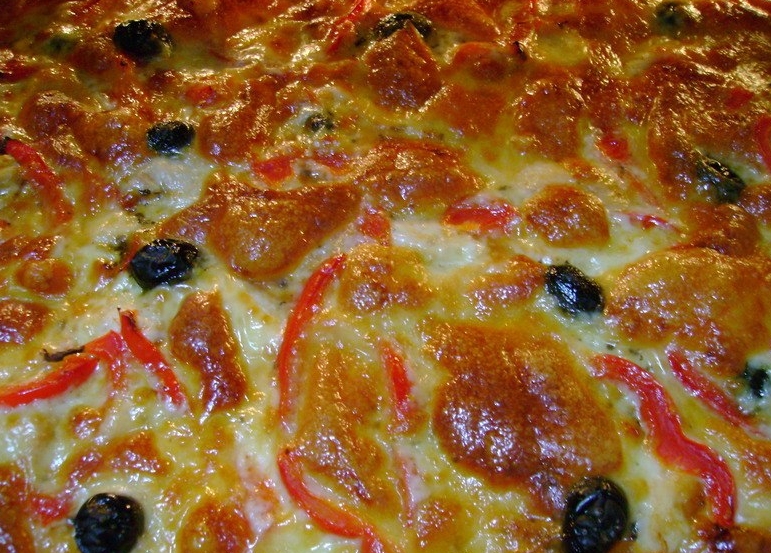 Pentru sos, se pun primele cinci ingrediente intr-un vas si cand acestea incep sa fiarba, se adauga laptele si se amesteca bine pentru a evita formarea cocoloaselor. In continuare se amesteca pana cand se ingroasa compozitia si apoi se adauga untul. Se intinde aluatul si se presara pe blat mozzarella, puiul, maslinele si ardeiul gras, adaugand si sosul in final. Se introduce la cuptor timp de 25 de minute.
