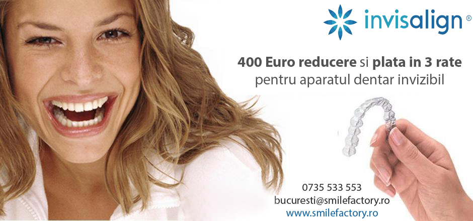 Profita de oferta verii! Ai reducere de 400 euro si plata in 3 rate pana la 31 iulie 2015 la aparatul dentar invizibil – Invisalign. Zambetul tau nu a fost niciodata mai frumos!