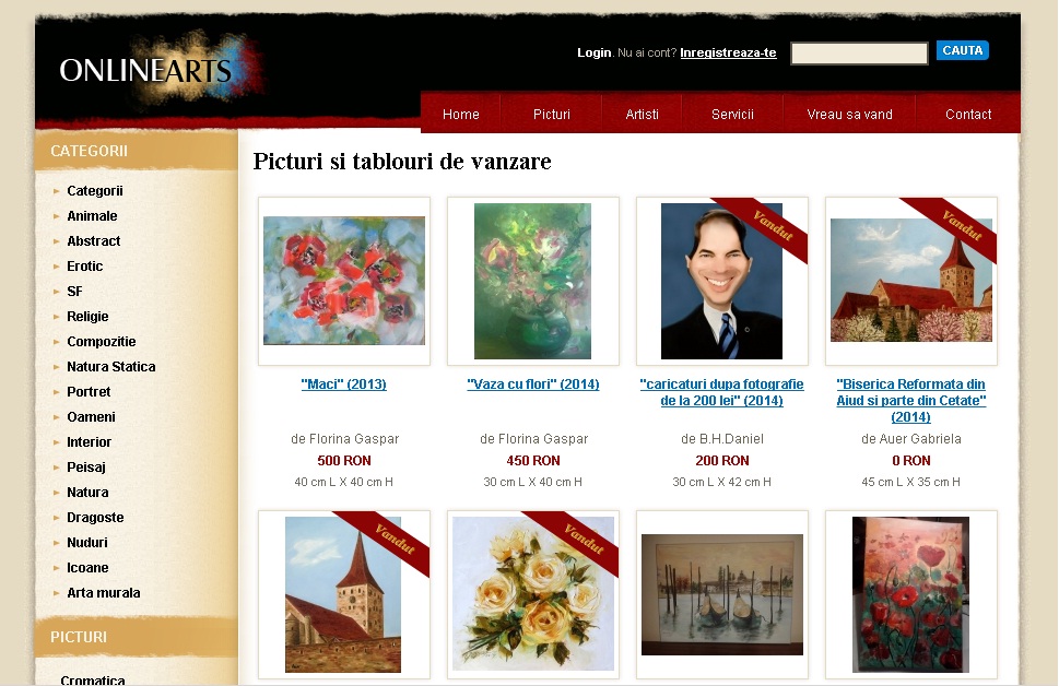 Esti artist si ai tablouri superbe, pe care nu ai unde sa le expui sau pe care vrei sa le vinzi? Nu mai trebuie sa cauti. OnlineArts este locul in care poti sa faci oricare dintre aceste lucruri. In principiu, orice artist poate sa isi expuna, aici, picturile pe care le are, la care pune un pret, care il cere pentru respectivul tablou, pentru fiecare in parte, iar cei interesati sa cumpere tablouri intra, iau legatura cu artistul, si stabilesc detaliile de cumparare/vanzare, asa cum cred de cuviinta.