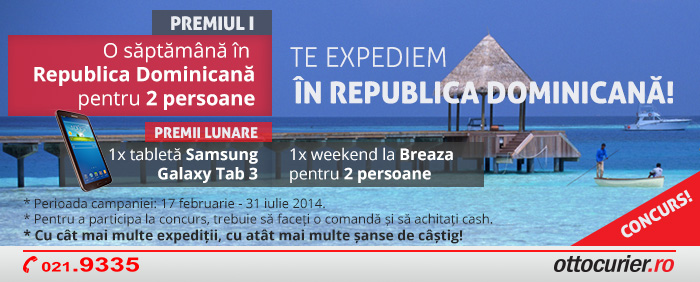 In perioada 17 februarie - 31 iulie 2014, orice expeditie comandata si achitata cash te inscrie automat in concursul pentru marele premiu, o excursie in Republica Dominicana pentru 2 persoane. In plus, in fiecare luna vor fi acordate premii constand intr-o tableta Samsung Galaxy Tab 3 si un weekend all-inclusive la Gclub Breaza Resort & SPA. Mai multe expeditii, mai multe sanse de castig!