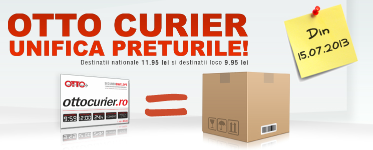 OTTO Curier pregateste o noua surpriza clientilor sai! Incepand cu 15.07.2013, costul unui colet este echivalent cu costul unui plic. Astfel, expedierea unui plic sau a unui colet cu greutatea pana intr-un kilogram catre destinatii nationale costa 11,95 lei, in timp ce expedierea acestora in aceeasi localitate va costa 9,95 lei. Oferta este valabila pentru toate serviciile nationale si reprezinta un pas inainte catre alinierea preturilor la cerintele pietelor de curierat.