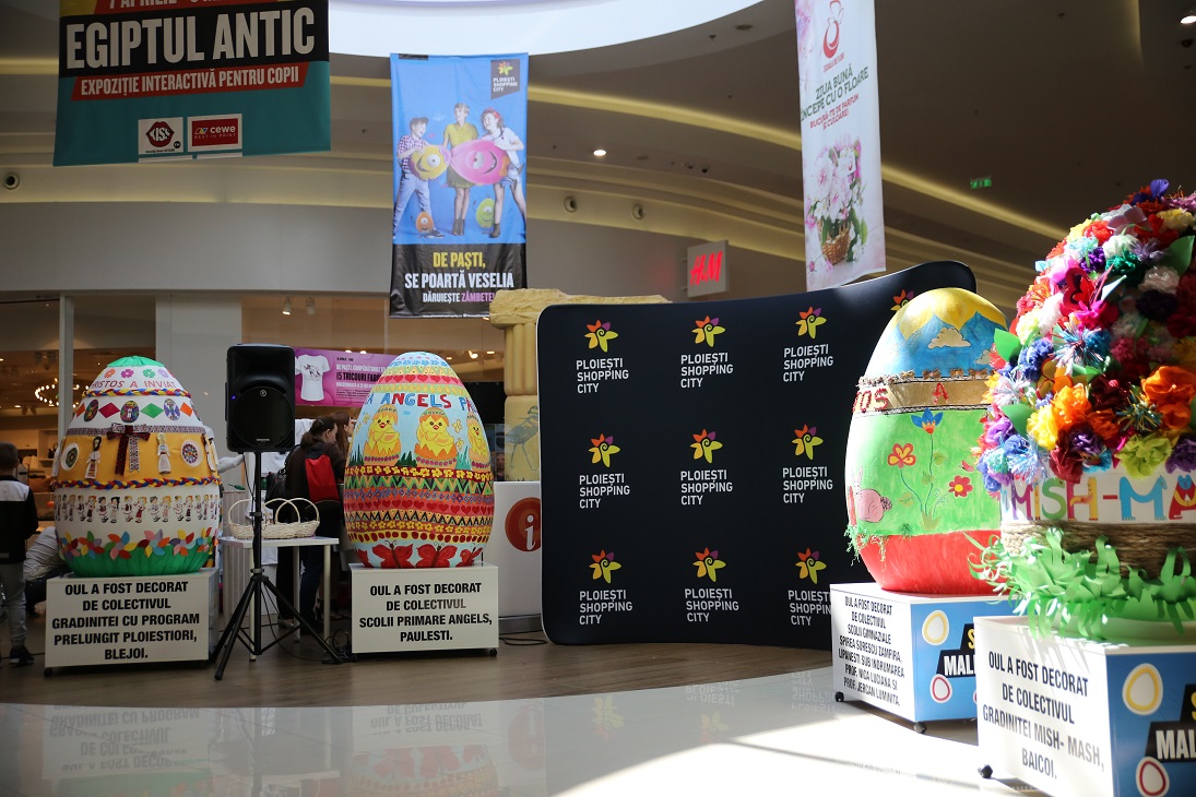 Expozitia „Sa decoram mall-ul impreuna” a fost lansata vineri, 22 aprilie in prezenta profesorilor si copiilor ce au lucrat la realizarea oualelor decorative supradimensionate. Cei mici au fost premiati si au plecat acasa cu diplome de recunoastere a talentului. Cele 12 institutii de invatamant implicate in proiect sunt: Colegiul Jean Monnet Ploiesti, Scoala Gimnaziala Sf. Vineri Ploiesti, Scoala Gimnaziala Sf. Vasile Ploiesti, Colegiul National Mihai Viteazu Ploiesti, Scoala Gimnaziala Grigore Moisil Ploiesti, Scoala Gimnaziala Radu Stanian Ploiesti, Colegiul De Arta Carmen Sylva Ploiesti, Gradinisa Ploiestiul in Culori, Scoala Primarp Angels Paulesti, Gradinita Mish Mash, Baicoi, Scoala Gimnaziala Spirea Sorescu Zamfira Lipanesti, Gradinita cu program prelungit Ploiestiori, comuna Blejoi.