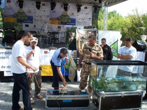 Reprezentanţii Serviciului de Poliţie Delta Dunării – Tulcea le-au arătat celor prezenţi cum acţionează braconierii care utilizează curentul electric, folosind un acvariu cu peşti(1) şi ustensile de braconat confiscate în timpul acţiunilor de control din Deltă.