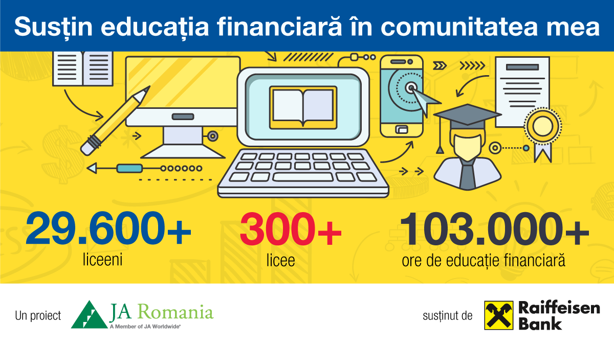 29.654 de elevi din 300 de licee au participat în acest an la cursul digital „Finanțele mele”, dezvoltat de Junior Achievement România și Raiffeisen Bank pentru formarea de abilități și comportamente responsabile necesare gestionării banilor prin economisire, investiții sau utilizarea instrumentelor financiare.