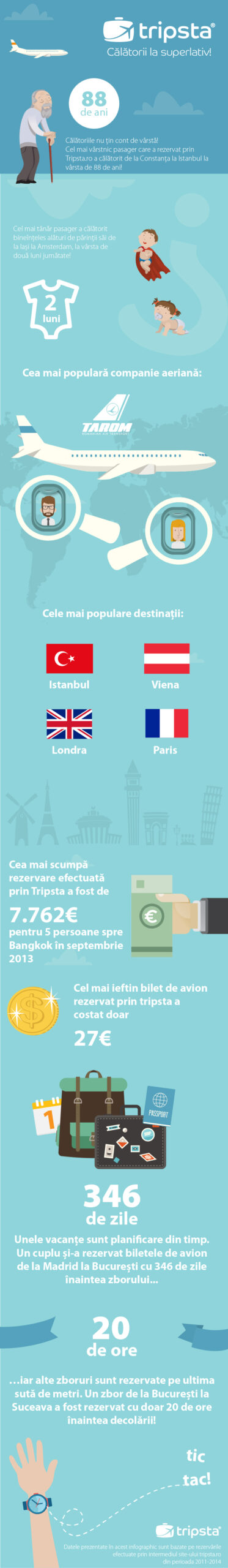 Cel mai varstnic pasager care si-a facut rezervare prin intermediul Tripsta ro are 88 de ani si a calatorit de la Constanta la Istanbul, in timp ce pasagerul cel mai tanar – de doar doua luni si doua saptamani – a mers impreuna cu parintii de la Iasi la Amsterdam.
