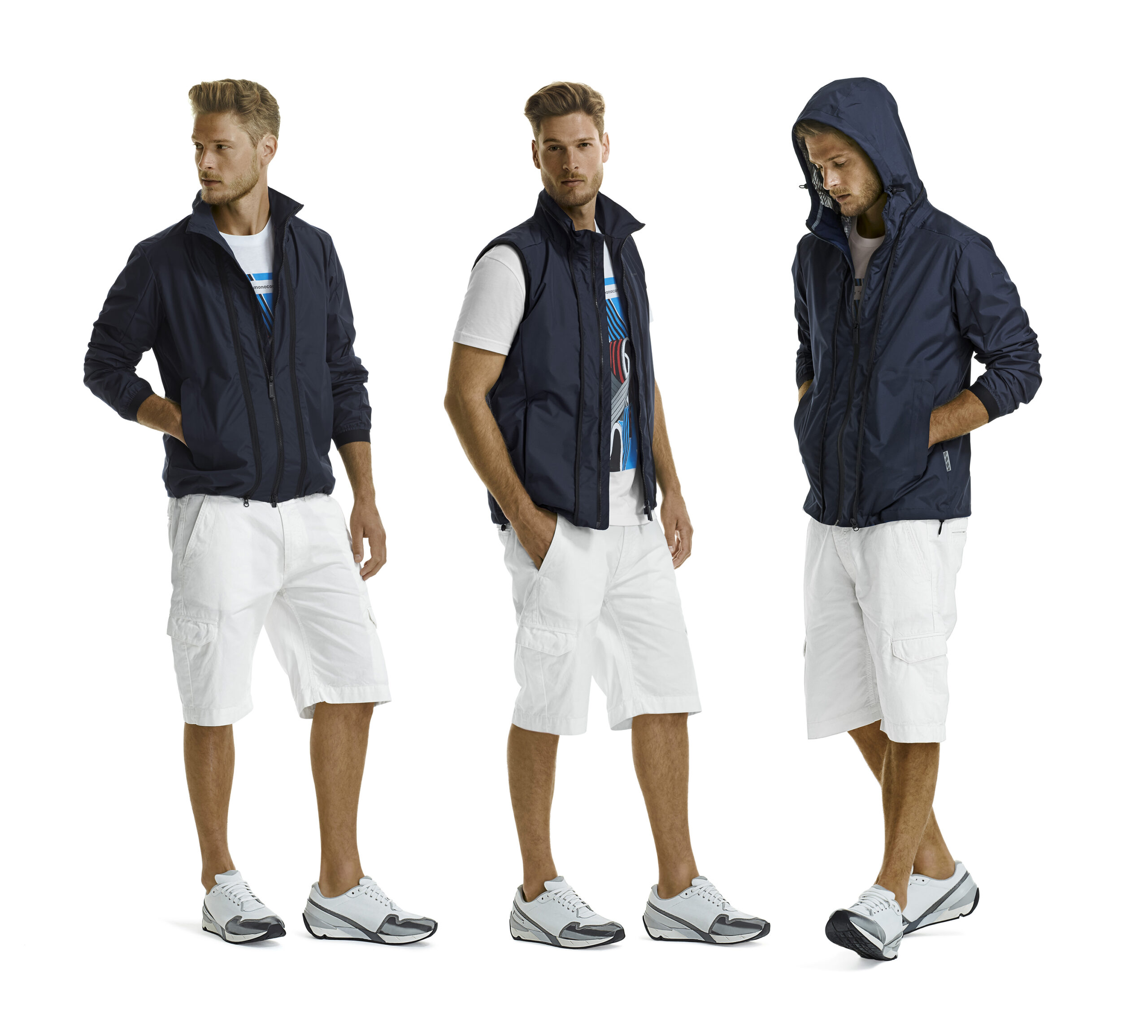 Gabardina şi pielea alb-gălbuie se îmbină în acest baschet cu talpă şi bombeu de cauciuc. Vârful este decorat cu o bandă lipită termic, care se transformă într-un motiv grafic. Simbolul negru lipit termic apare pe mocasinii din piele tăbăcită în nuanţe ce variază de la alb rece la bleumarin, bej nisip şi verde.