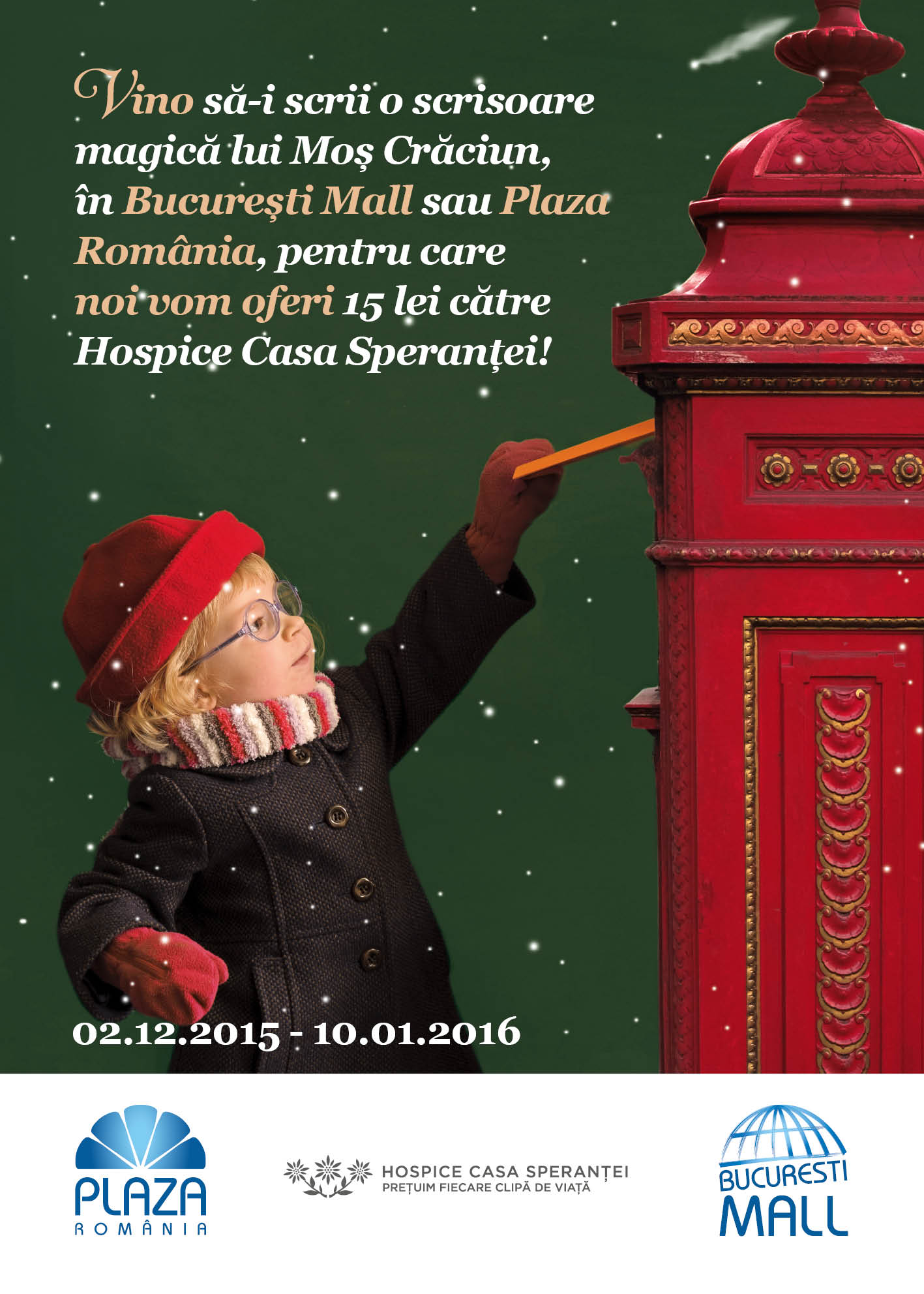 Plaza Romania si Bucuresti Mall ofera 15 lei Fundatiei Hospice Casa Sperantei pentru fiecare scrisoare catre Mos Craciun
