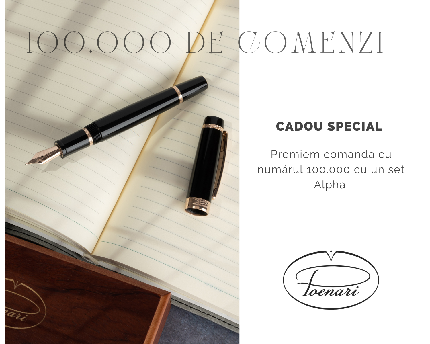 Echipa Poenari este încântată să anunțe că se apropie de numărul impresionant de 100.000 de comenzi plasate. Pentru a sărbătorii acest moment, comanda înregistrată cu numărul 100.000 va fi premiată cu un set Alpha, ce conține un stilou elegant și un pix asortat. Astfel, toți cumpărătorii au șansa de a câștiga instrumentele de scris, dacă plasează o comandă pe site, în această perioadă.