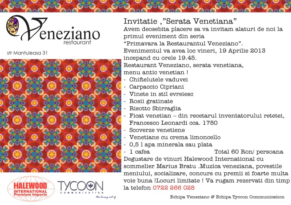Am pregatit pentu voi, un bufet suedez cu produse din anticul meniu venetian, degustare de vin cu sommelierul Cramelor Halewood, Marius Bratu,mini recital de muzica venetiana la flaut cu Oana Leonte, concursuri cu premii si alte surprize placute.Invitat special al evenimentului, va fi Domnul Giancorrado Ulrich, oenologul prestigioasei case de vinuri Antinori si Presedintele Vitis Metamorfosis. Va urma o calatorie pe vasul Veneziano iar porturile unde ne vom opri alaturi de voi, sunt : Mexic cu muzica sa senzationala si produse gastronomice de exceptie,Peru cu un Pisco Sour nemaipomenit si gustari peruane cu gusturi unice, Emilia Romagna pentru a degusta adevaratele paste fainoase realizate manual, apoi ne vom opri intr-un port numit Grana Padano, pentru a cunoaste povestea acestei branze unice; in nenumarate porturi cu vin de excelenta si arta, dar nu numai. Restaurantul Veneziano incepand cu aceasta primavara, devine unul dintre sustinatorii artei romanesti si veti gasi de acum incolo in aceasta frumoasa locatie, expuse colectii de arta a artistilor renumiti si a artistilor la inceput de drum.