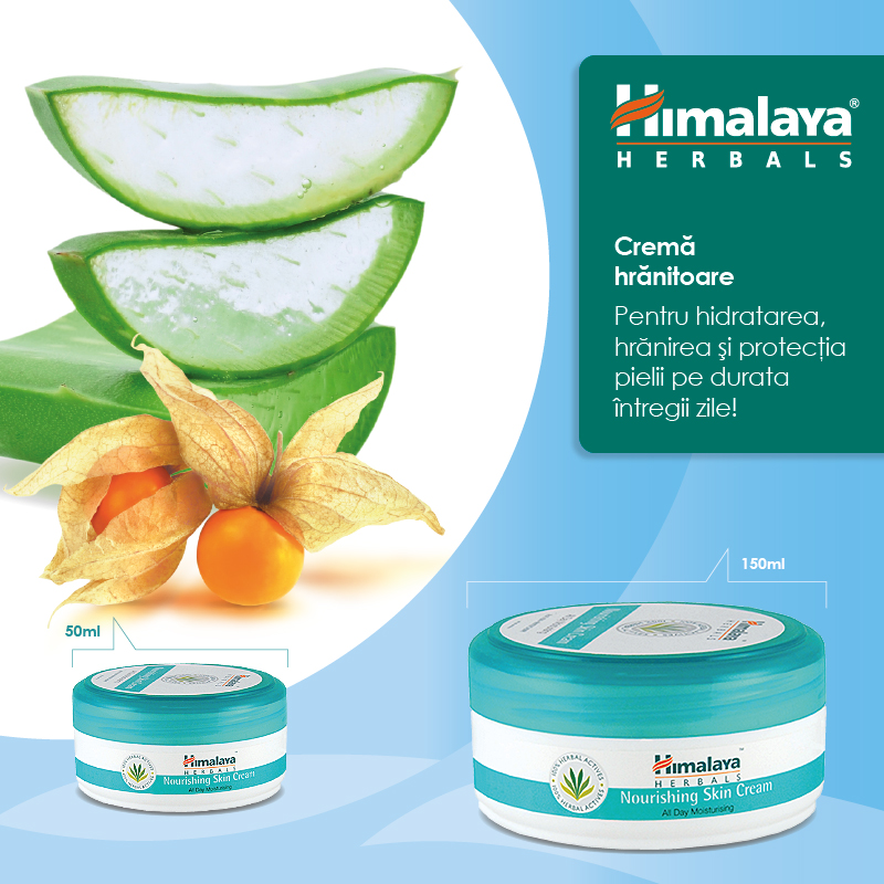 Himaya Herbals vine in ajutorul dumneavoastra si va ofera o crema hranitoare cu textura usoara, non-grasa, indicata pentru toate tipurile de piele. Avand ca ingrediente principale Aloe vera, ce hraneste si hidrateaza intensiv pielea si Ginseng indian, care ofera protectie impotriva factorilor externi agresivi precum poluarea si clima uscata, Crema hranitoare de la Himalaya Herbals asigura protectia pielii pe durata intregii zile. Un alt avantaj major care va va convinge sa o incercati este acela ca produsul se poate utiliza atat pe fata si gat, cat si pe corp.