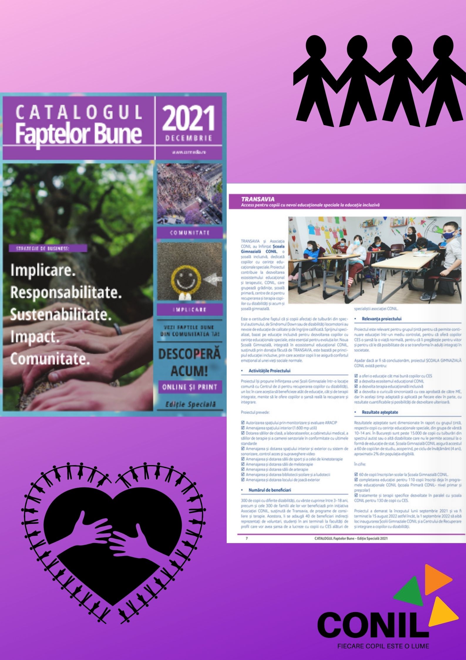 “Acest lucru nu poate decât să ne bucure, să ne onoreze și să ne motiveze în același timp. Proiectul Școlii Gimnaziale Conil este un proiect care a crescut organic, un proiect care are în spate ani întregi de activitate în zona educației, terapiei și tratamentului copiilor cu dizabilități. El a venit ca următorul pas firesc al dezvoltării ecosistemului nostru educațional - care acum cuprinde grădinițe, școală primară, centre de zi și afterschool, și este expresia angajamentului nostru continuu de a oferi copiilor cu cerințe educaționale speciale șansa unei educații corespunzătoare și implicit șansa unei vieți normale, nu la periferia marginalizării sociale ci ca membrii activi și implicați în comunitățile din care fac parte. De aceea atunci când TRANSAVIA a decis să se alăture efortului nostru și să sprijine acest proiect, acest lucru a însemnat confirmarea, și din zona corporate, a unui proiect fezabil, bine structurat și cu adevărat benefic pentru comunitate. Iar includerea acestui proiect în Catalogul Faptelor Bune, înseamnă, dincolo de recunoașterea oficială a calității proiectului nostru în termeni de analiză a managementului de proiect - scop, obiective, activități, public țintă, rezultate - indicatori pe care orice campanie de CSR îi urmărește cu maximă atenție, confirmarea că pasul pe care am decis să îl facem este cel corect” - Adela Caragheorghe, președinte Asociația Conil