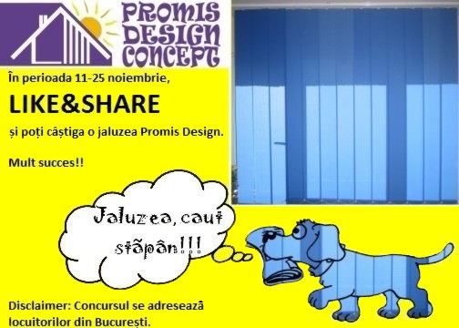 Concursul se desfasoara in mediul online pe pagina de Facebook Promis Design Concept si dureaza 2 saptamani. Pentru a participa la ”JALUZEA, CAUT STAPAN!”, doritorii trebuie sa dea LIKE&SHARE machetei concursului de pe si pot castiga o jaluzea marca Promis. Castigatorul va fi extras prin random si anuntat pe pagina de Facebook.
