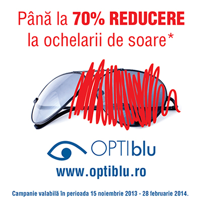 OPTIblu te asteapta cu reduceri de pana la 70% la ochelarii de soare. Promotia este valabila in perioada 15.11.2013 – 28.02.2014, pentru detalii consultati regulamentul disponibil in magazinele OPTIblu.
