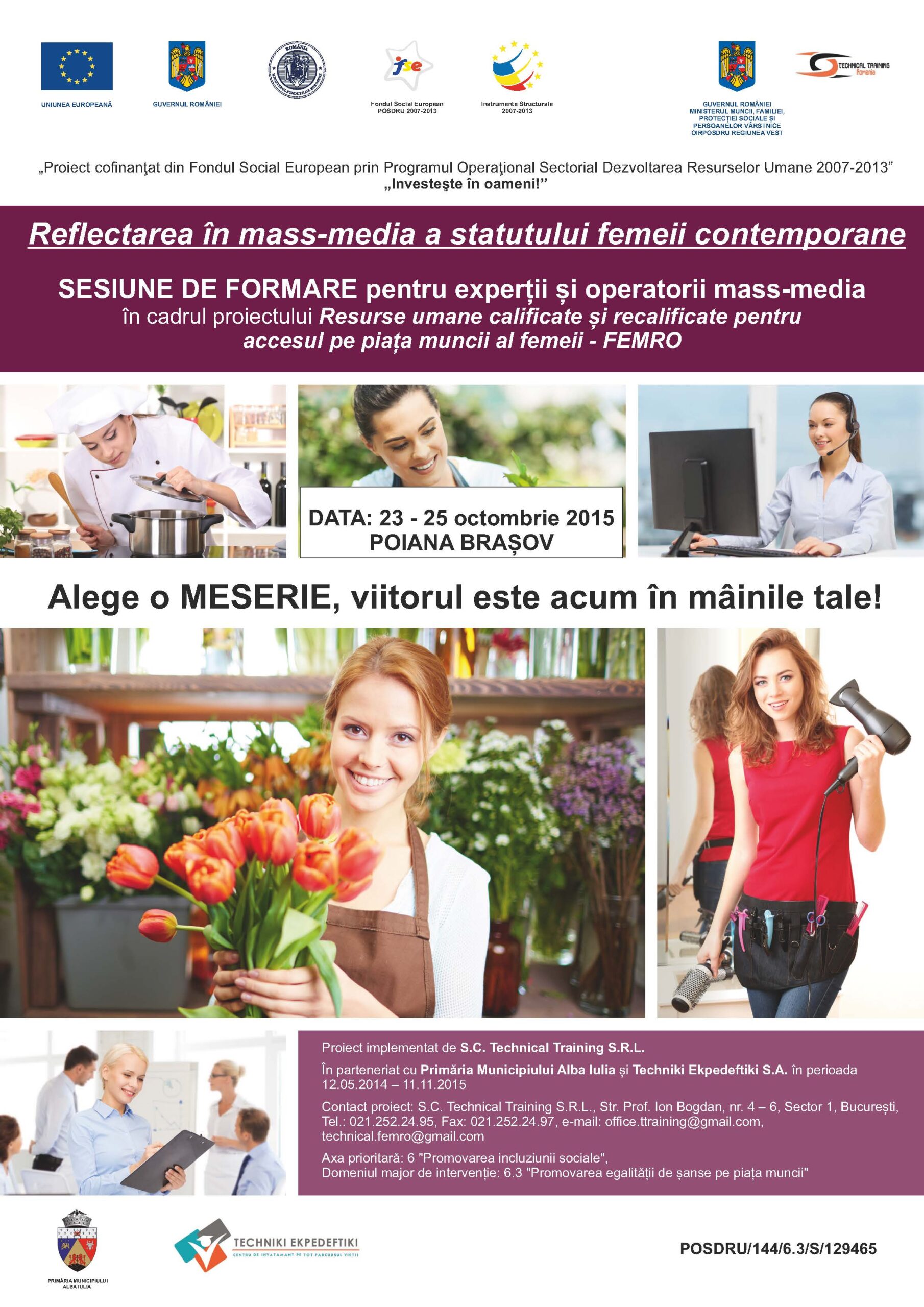 Evenimentul este susținut în cadrul proiectului strategic Resurse umane calificate și recalificate pentru accesul pe piața muncii al femeii – FEMRO, proiect cofinanțat din Fondul Social European prin Programul Operațional Sectorial Dezvoltarea Resurselor Umane 2007 – 2013 ”Investește în oameni!”