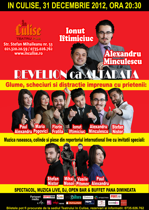 Pe 31 Decembrie petrece la Teatrul În Culise un Revelion ca Altădată! Tu trebuie doar să te simţi bine, de restul ne ocupăm noi! Spectacol, muzică live, MC şi DJ, Open Bar şi Bufet Suedez până dimineaţa târziu.
