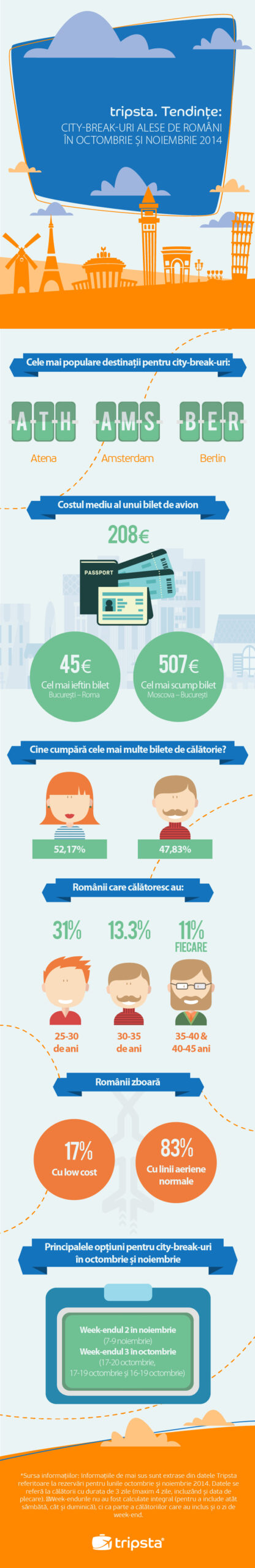 Potrivit datelor Tripsta, pretul mediu al unui bilet de avion pentru un city-break achizitionat de catre calatorii romani este de 208 Euro. Cele mai ieftine bilete sunt disponibile pe rutele Bucuresti-Roma (45 Euro) si Frankfurt – Paris (91 euro), in timp ce biletele cele mai scumpe sunt de la Moscova la Bucuresti (507 euro), de la Atena la Belgrad (364 Euro) sau din Bucuresti in Malta (343 Euro)