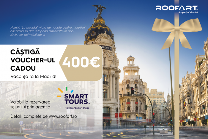 RoofArt România desfășoară, în perioada 2 aprilie 2018 – 30 aprilie 2018, o nouă campanie dedicată partenerilor săi, la sfârșitul căreia aceștia au șansa de a câștiga un voucher în valoare de 400 euro pentru o vacanță la Madrid.