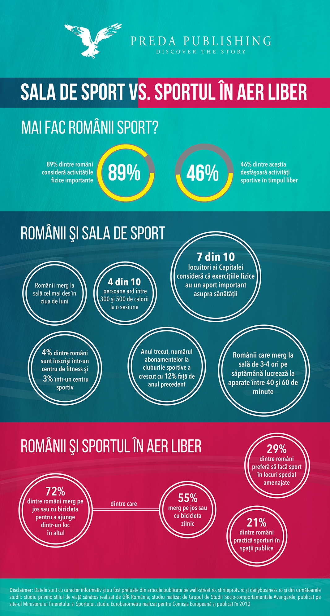 Nu mai este un secret pentru nimeni. Practicarea unui sport este un lucru sanatos, indiferent de mediul in care alegi sa o faci: intr-o sala de sport sau in aer liber. Daca serviciul tau presupune un mod de viata stresant si sedentar, este recomandat ca miscarea sa devina o prioritate in programul tau. Dar desi 89% dintre romani considera activitatile fizice importante, numai jumatate dintre acestia (46%) le si practica in timpul lor liber. In ceea ce-i priveste pe bucuresteni, 7 din 10 cred ca miscarea are un aport important asupra sanatatii lor. Editura Preda Publishing sustine practicarea sportului in toate formele sale, indiferent ca este vorba de salile de sport sau in aer liber. Beneficiile nu vor intarzia sa apara atat la nivel fizic, psihic, cat si social. Intrebarea care se pune, in acest sens, este urmatoarea: Ce e mai atractiv pentru romani: sportul indoor sau outdoor?