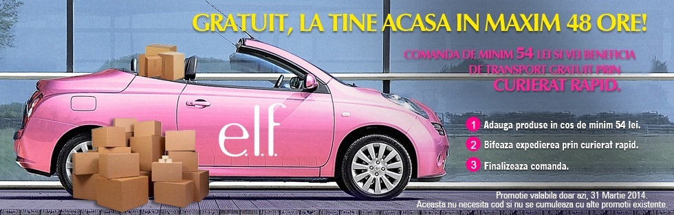 In plus, azi si doar azi se ofera transport gratuit tuturor persoanelor care fac o comanda mai mare de 54 de lei. Astfel, comanda ta va ajunge la tine acasa in mai putin de 48 de ore, fara niciun cost. Profitati de ofertele e.l.f. si veti beneficia mereu de bonusuri si reduceri foarte avantajoase. Trebuie doar sa le urmariti, abonandu-va la newsletter!