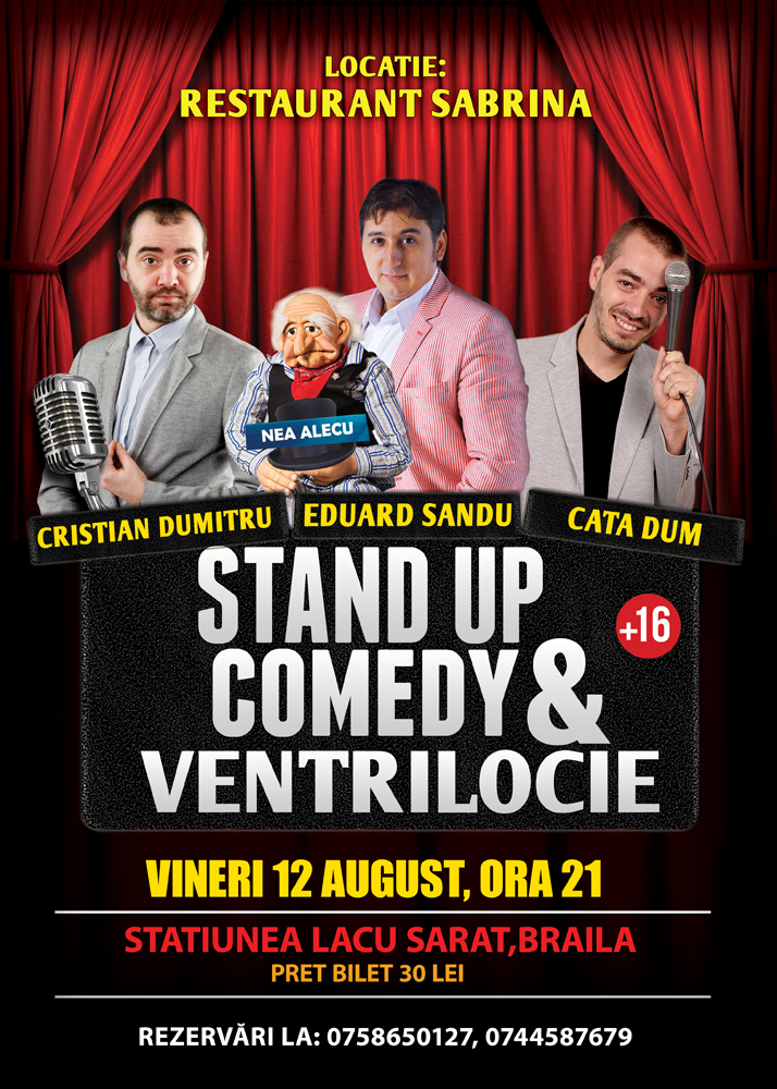 Vineri 12 august Restaurantul Sabrina din lacul sarat (Braila) te invita sa vezi cel mai tare spectacol al acestei veri. Spectacolul de stand-up comedy & ventrilocie imbina cu succesc doua spectacole in unul singur.