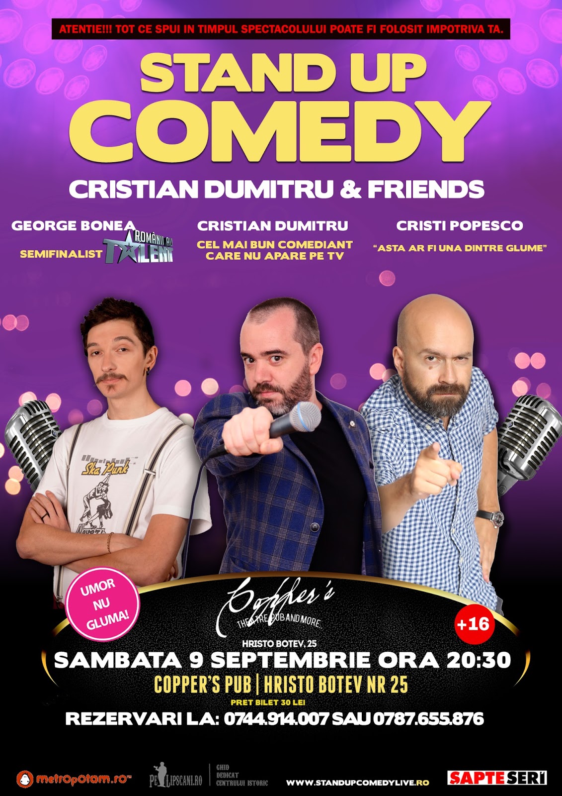 Pe 9 Septembrie te vor face sa razi cu gura pana la urechi: George Bonea (semifinalist Romanii au talent), Cristi Popesco (zis si “asta ar fi una dintre glume”) si Cristian dumitru (cel mai bun comediant care nu APARE PE TV)