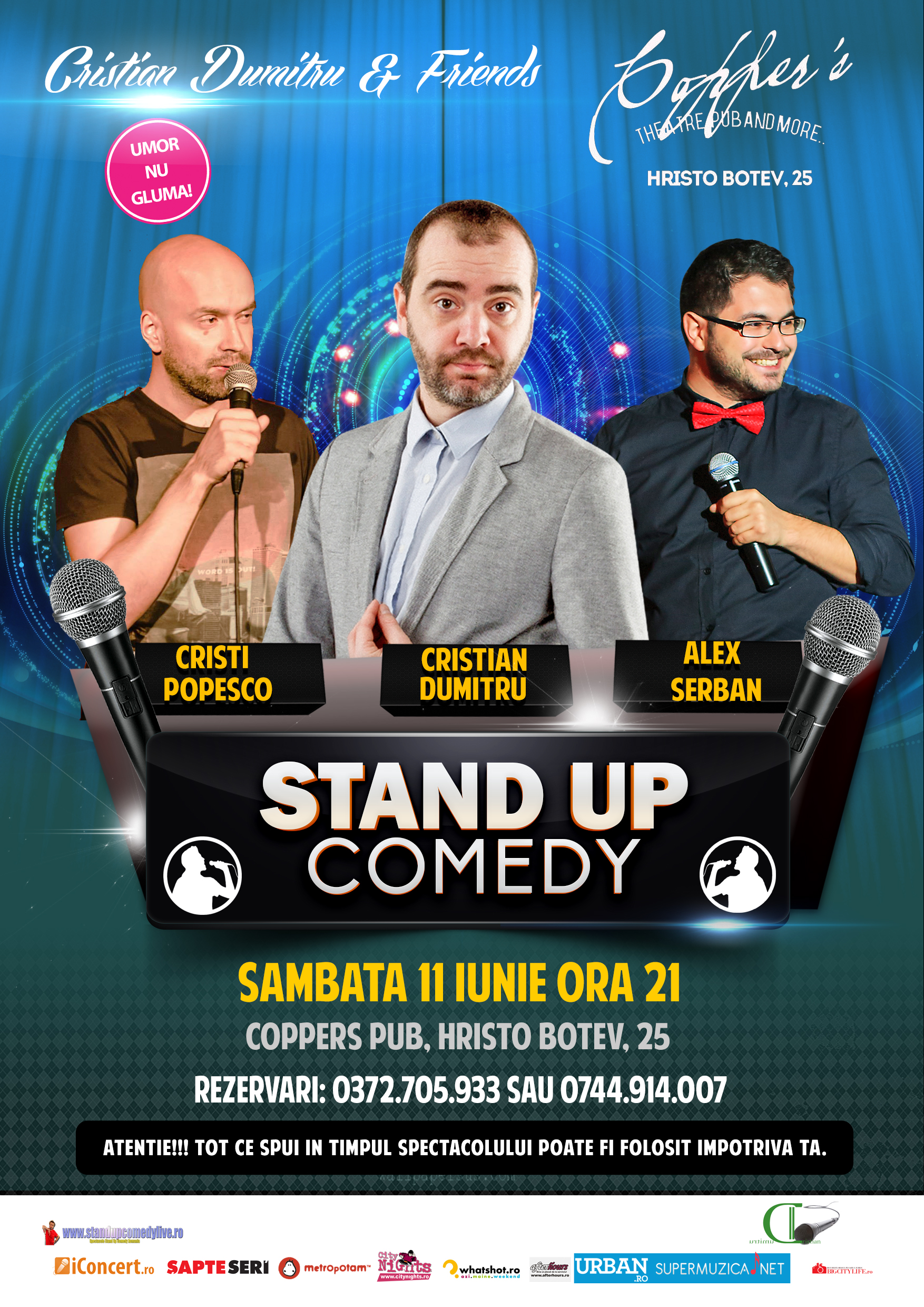 Sambata, 11 iunie vino la Copper’s Pub (str. hristo botev nr 25) pentru un nou spectacol de stand-up comedy. Se anunta de pe acum hohote de ras si ropote de aplauze.