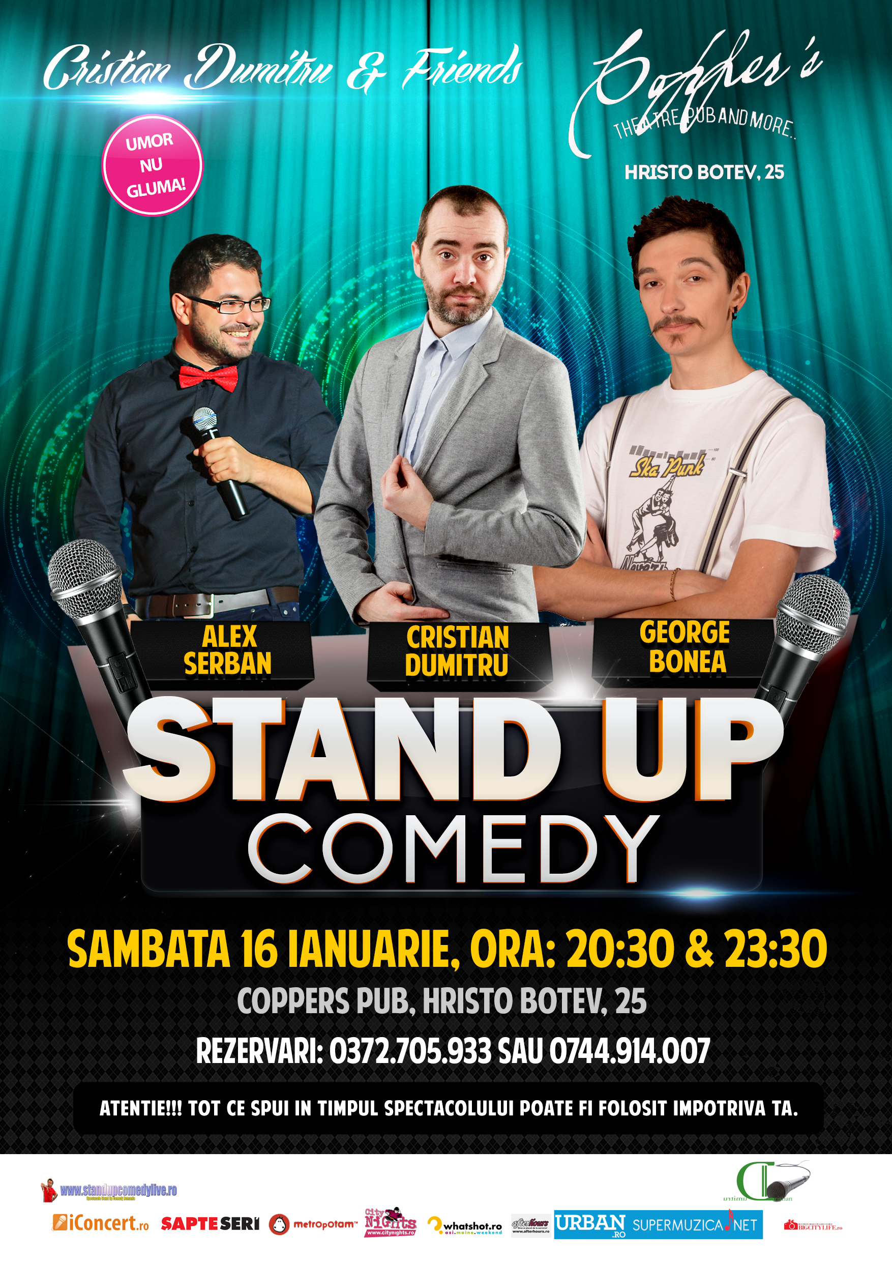 Daca e sambata, atunci e Stand-Up Comedy la dublu. Te asteptam de la 20:30 si de la 23:30 la Copper’s Pub (hristo botev nr 25) sa vezi un spectacol marca “Cristian Dumitru & Friends”. Nu rata cel mai interactiv show de stand-up comedy din Romania.
