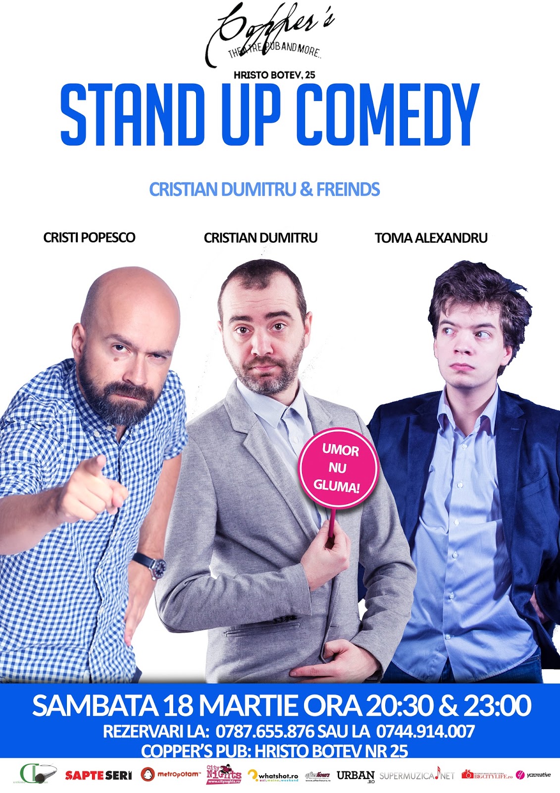 Vino Sambata, 18 martie la Copper’s Pub de la 20:30 si de la 23:00 sa vezi un spectacol UNIC de stand-up comedy cu 3 dintre cei mai buni comedianti romani.