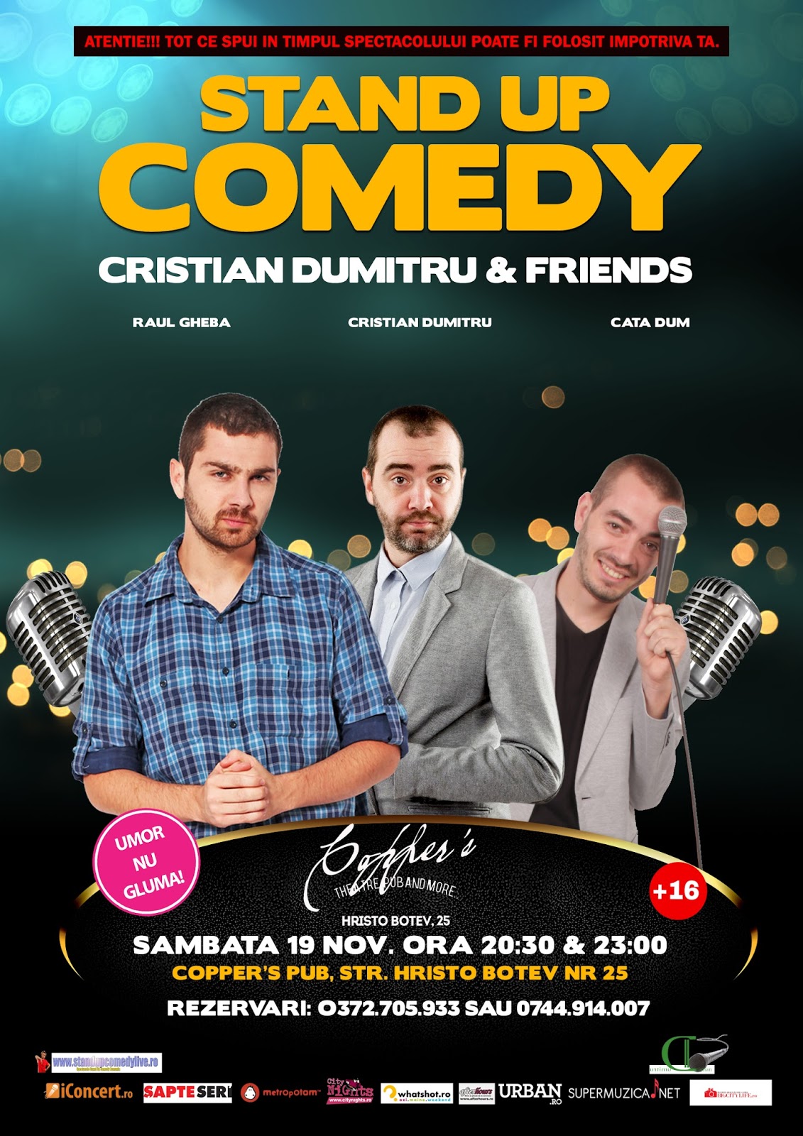 Sambata, 19 noiembrie Copper’s Pub te asteapta de la 20:30 sau de la 23:00 sa vezi un spectacol unic de stand-up comedy cu Cata Dum, Raul Gheba si Cristian Dumitru.