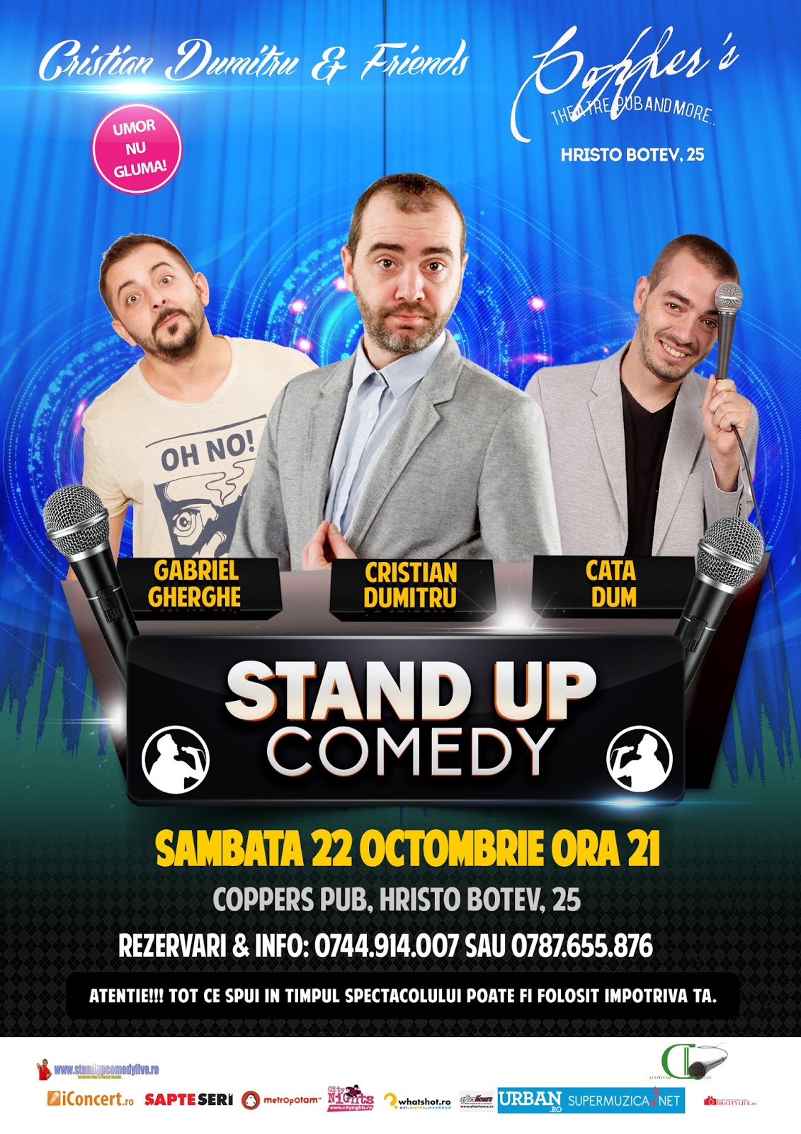 Sambata, 22 octombrie Copper’s Pub iti ofera un nou show de stand-up comedy marca : “Cristian Dumitru & Friends”. Daca vrei sa razi cu gura pana la urechi tot ce trebuie sa faci este sa iti rezervi un loc in sala la spectacolul sustinut de Cata Dum, Gabriel Gherghe si Cristian Dumitru.