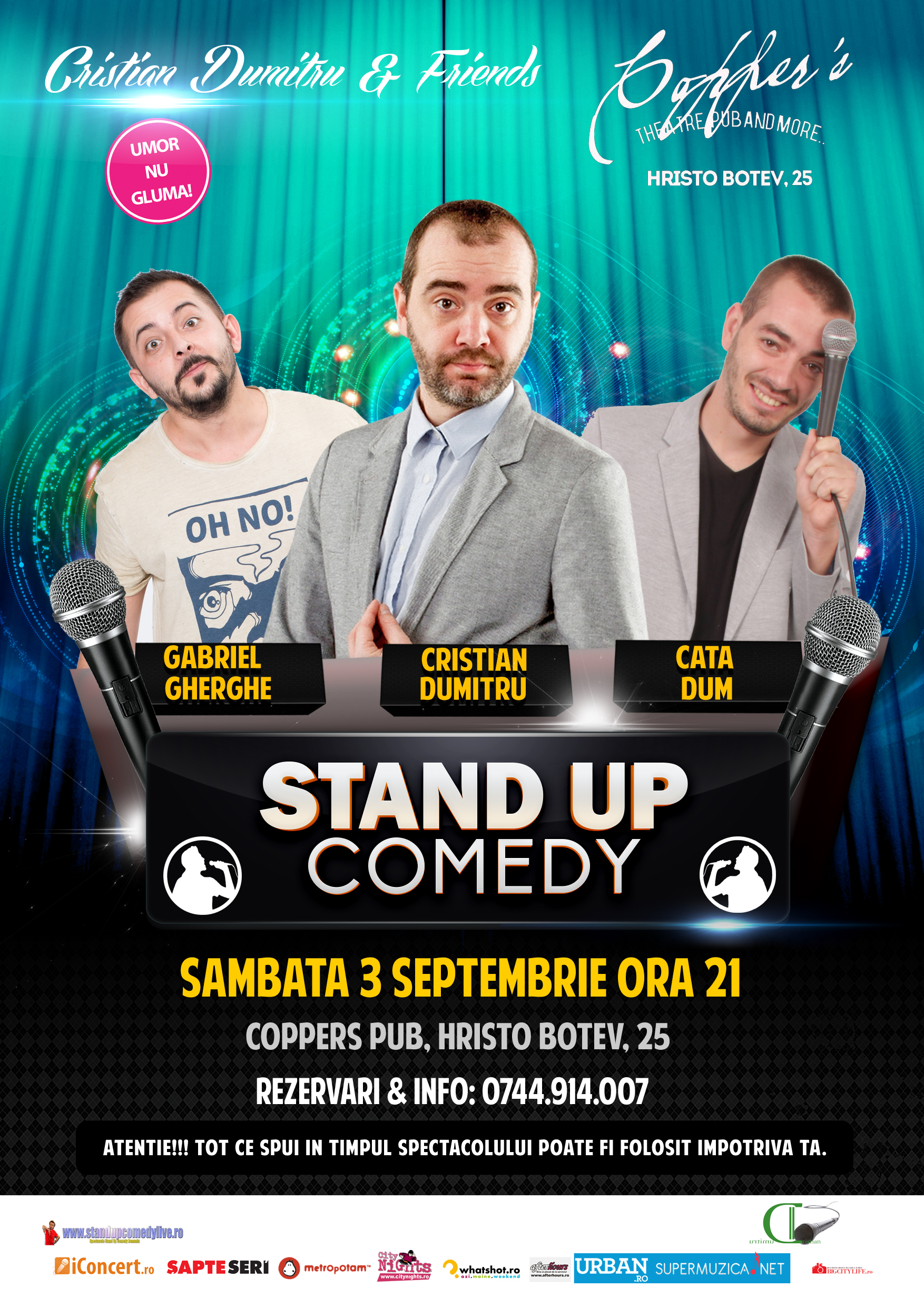 Daca e Sambata atunci e Stand-Up Comedy Show la Copper’s Pub. Nu rata cele mai tare show din bucuresti sustinut de Gabriel gherghe, Cata Dum si Cristian Dumitru.