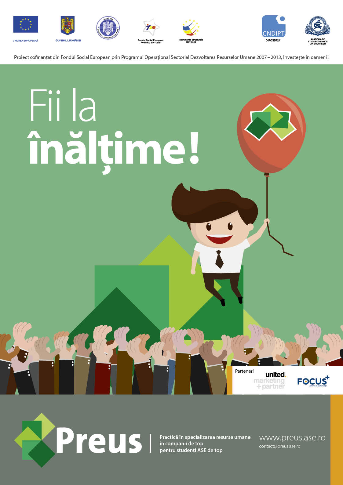 „PREUS – Fii la inaltime” a fost implementat de ASE Bucuresti, in parteneriat cu Focus Plus - companie de consultanta organizationala, de afaceri si de programe de formare – si cu United, agentie de marketing full-service, fiind cofinantat din Fondul Social European prin Programul Operational Sectorial Dezvoltarea Resurselor Umane 2007–2013, Axa prioritara nr. 2 corelarea invatarii pe tot parcursul vietii cu piata muncii, domeniul major de interventie 2.1 „Tranzitia de la scoala la viata activa”.